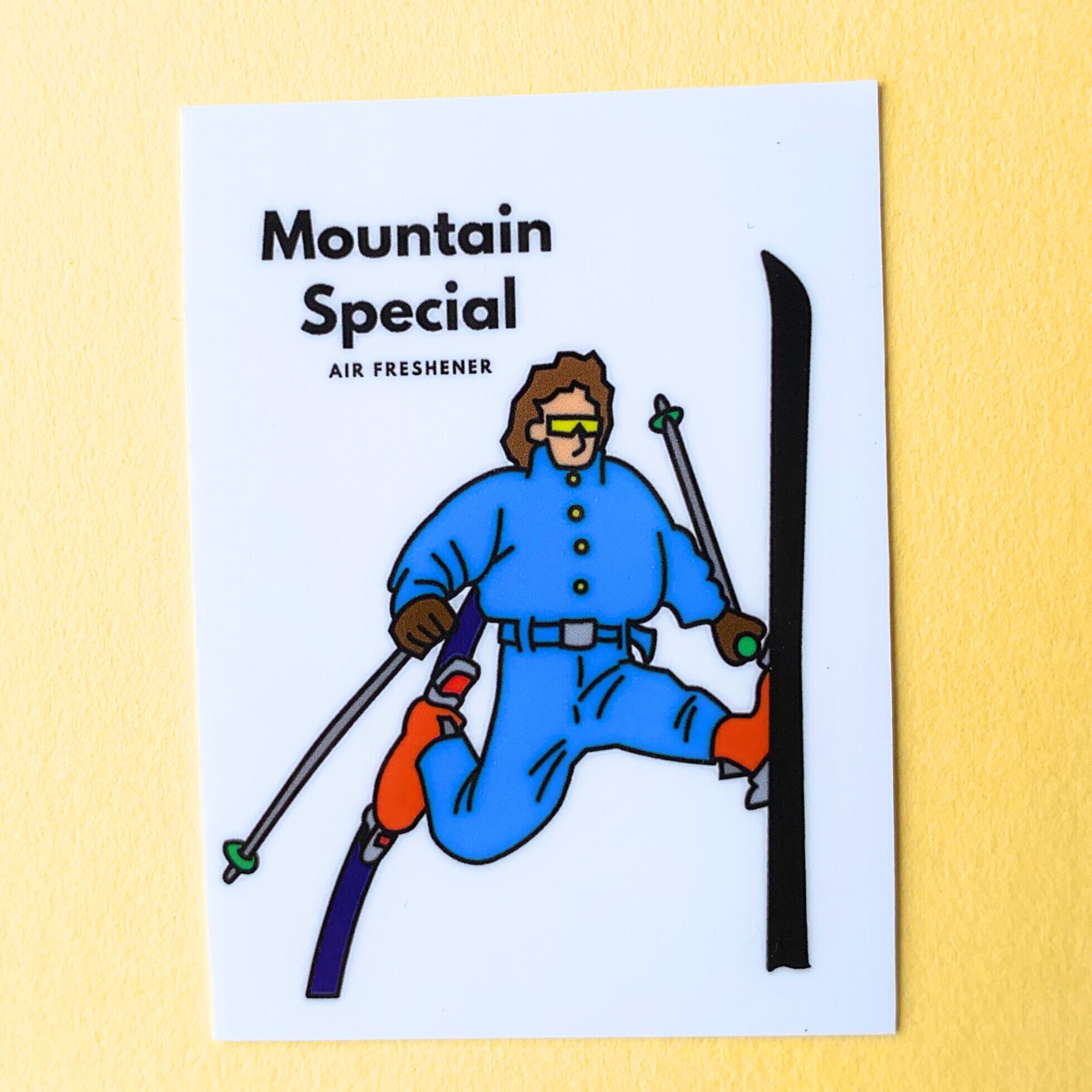 初期デザインのスキーヤー001-1とハイカーが描かれたブランドアイコンとヤマネコのステッカーです。