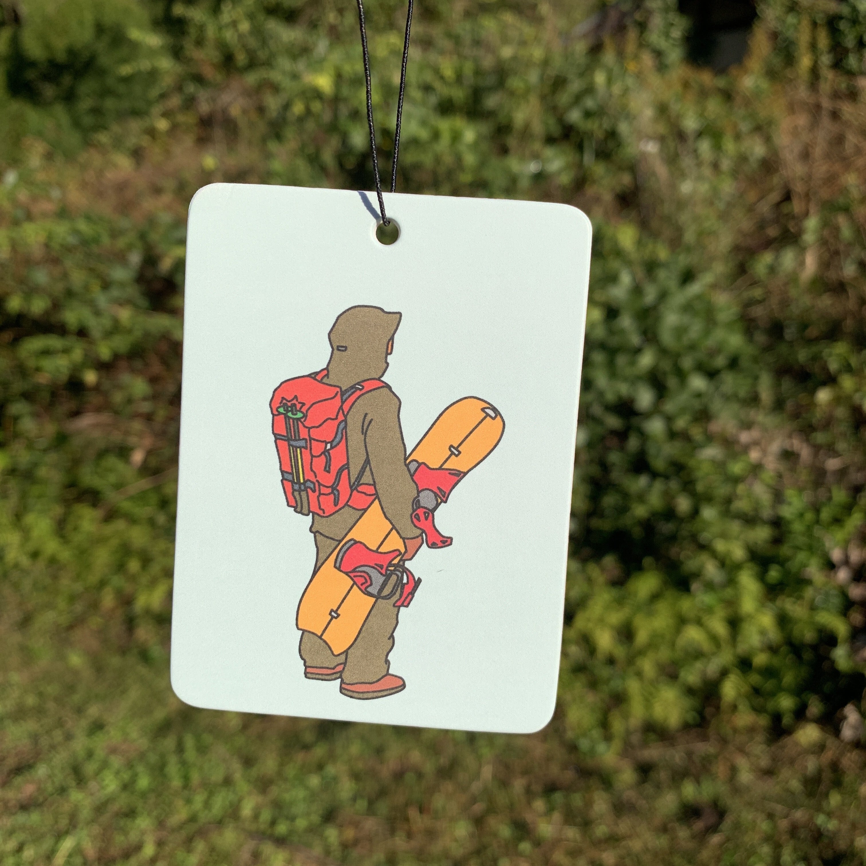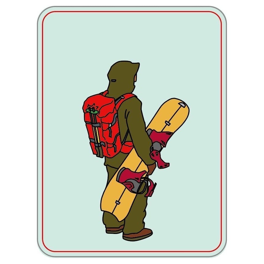 バックカントリーのフィールドに赴くスノーボーダーです。今回は現代のオーソドックスな装いでイラストにしました。スプリットボード、アースカラーのウェア、大きなバックパックなどベテランの風格かな?山で出会うスノーボーダーはこなれた雰囲気があってカッコイイですよね。
